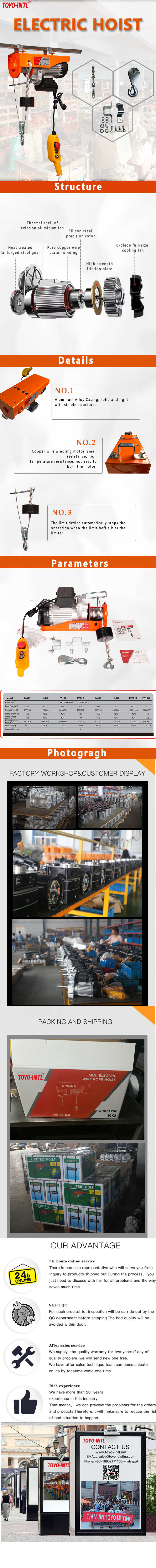 Adopts anti-rotation aviation special steel wire rope with highsafety factor and long service life.
