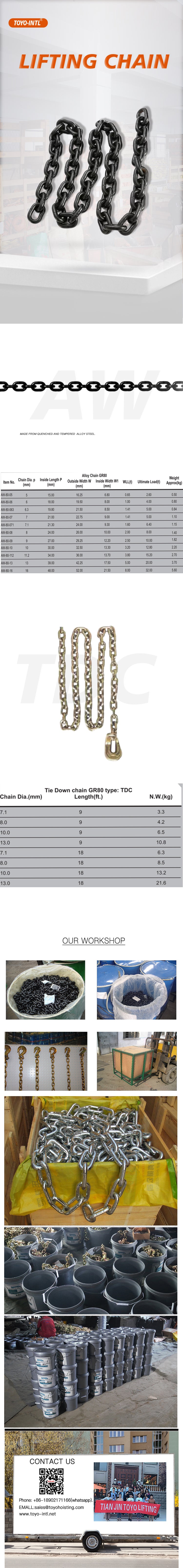 Alloy chain is designed and manufactured for superior performance and usage. It can easily withstand more abuse, abrasion resistance, greater load lifting per size and is lighter to handle for application.